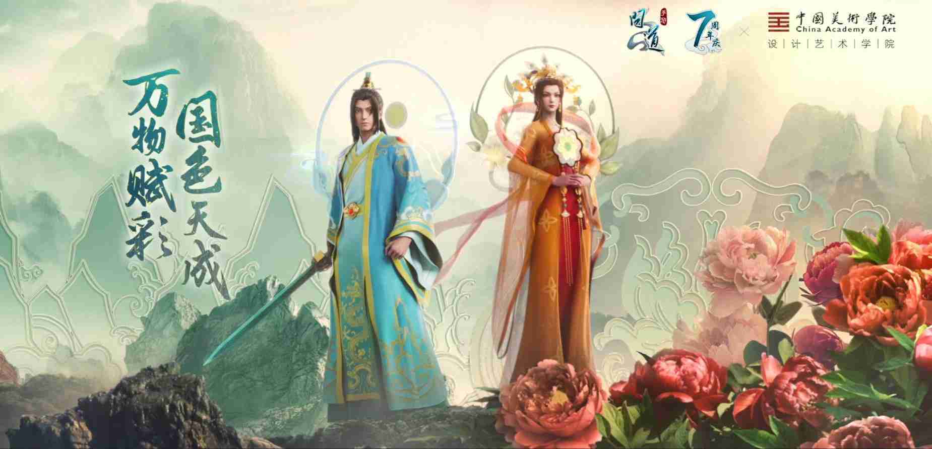 2023年4月,,,《问道手游》联动中国美术学院,,,在游戏中融合了中国历史上不同时期的文化元素,,打造了“山河万象”与“凤鸣九霄”的国风时装。。。在色彩配置方面,,创作团队基于对游戏角色特性的分析提取相应的文化内涵,,,,从每一种色彩的色相、、指代事物和情感出发对应角色属性,,选定服装的色彩搭配。。在纹样设计方面,,,,创作团队结合游戏角色自身特殊的造型比例和形态,,,,在实际的纹样设计中进行了游戏语境下的活化演绎。。男性角色集中使用了如蟒纹、、、、海水江崖纹、、、如意纹和云气纹等传统纹样元素,,,女性角色则吸纳了凤凰纹、、、牡丹纹、、、、卷草缠枝纹等元素,,,,组成以“双凤牡丹纹样”“缠枝牡丹纹”“金玉凤冠头饰”为主要纹样的游戏角色装饰图案系统。。。