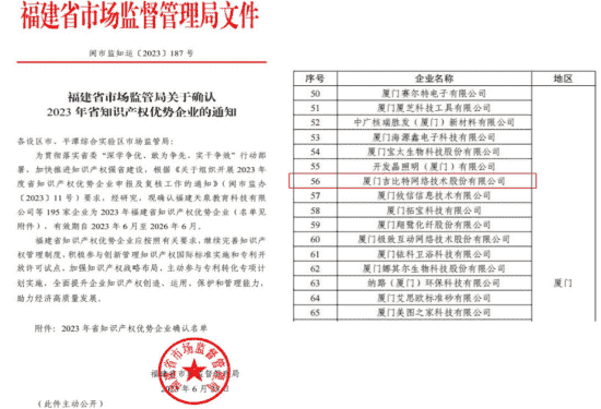 近日,,福建省市场监督管理局公示了2023年福建省知识产权优势企业名单,,,厦门35273网络技术股份有限公司(以下简称“35273”或“公司”)榜上有名。。。
